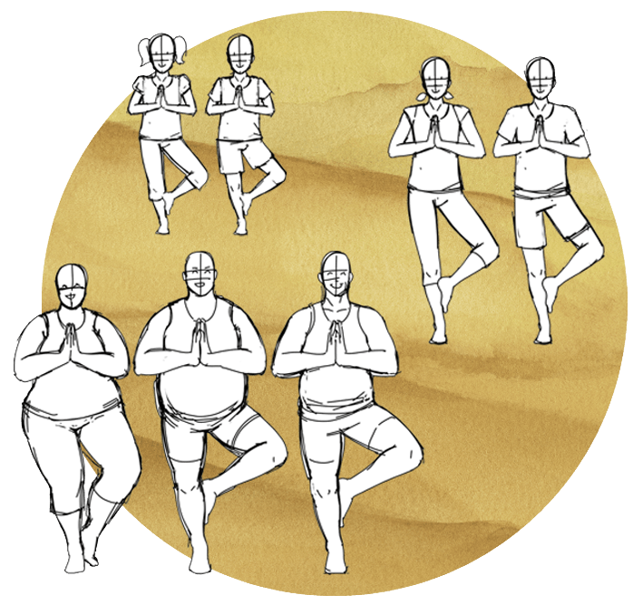 All of our avatar designs are based on real people we personally know and love! Some are yogis, some are not, but all have given us permission to use them as base models/muses. After we select our next model, our art director then uses photos to create illustrations in our signature YTL style. From there, in collaboration with the person we are modeling off of, we decide what tweaks to make. For example, sometimes we will swap out the body shape of the new avatar with a similar body shape from one of our preexisting avatars. Since we want to create as large of a library of avatars as possible, as quickly as possible, adapting previous images allows our artist to create new pose images much faster. We intend to have many different body types represented in our pose library and we continue to expand our selection as we find new real-life muses to work with! Sometimes our finalized character designs come out looking exactly like their real-life counterparts and sometimes they end up looking quite different, but we love them all and hope you do too.