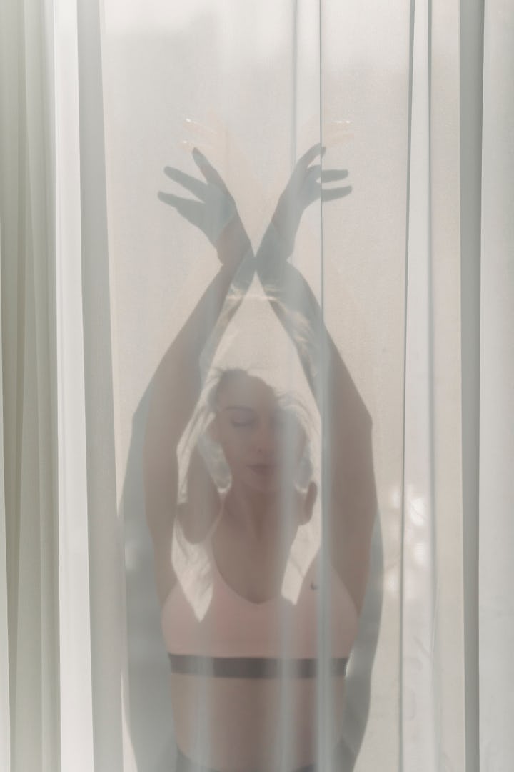 woman arms up through a curtain