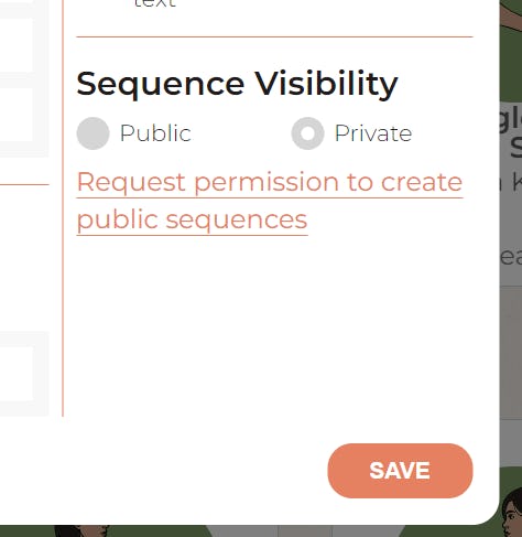 To request public sequence permissions, go to settings within the sequence builder (next to title text box). The settings box will pop up and in the bottom right hand corner you will see "Sequence Visibility"