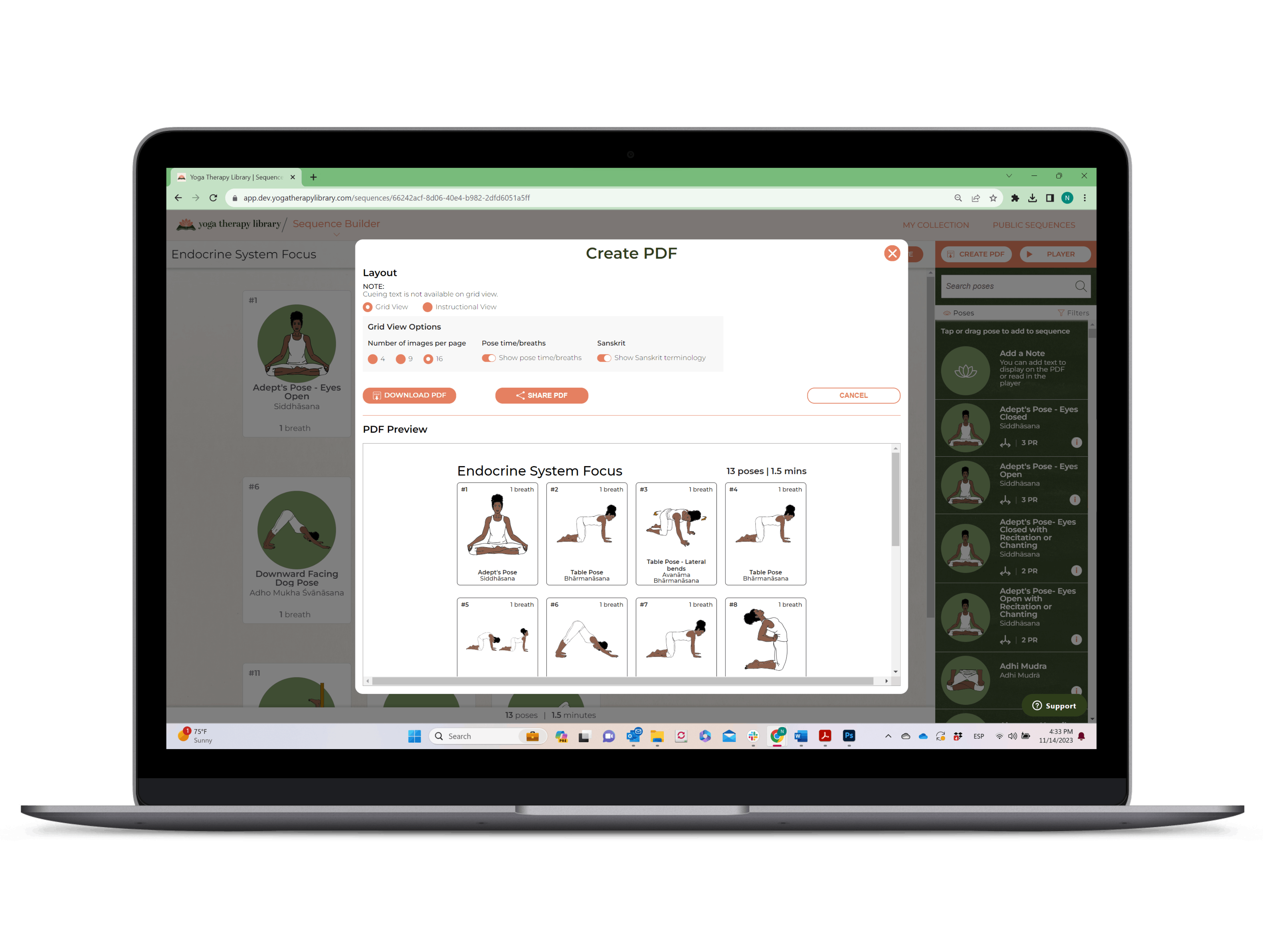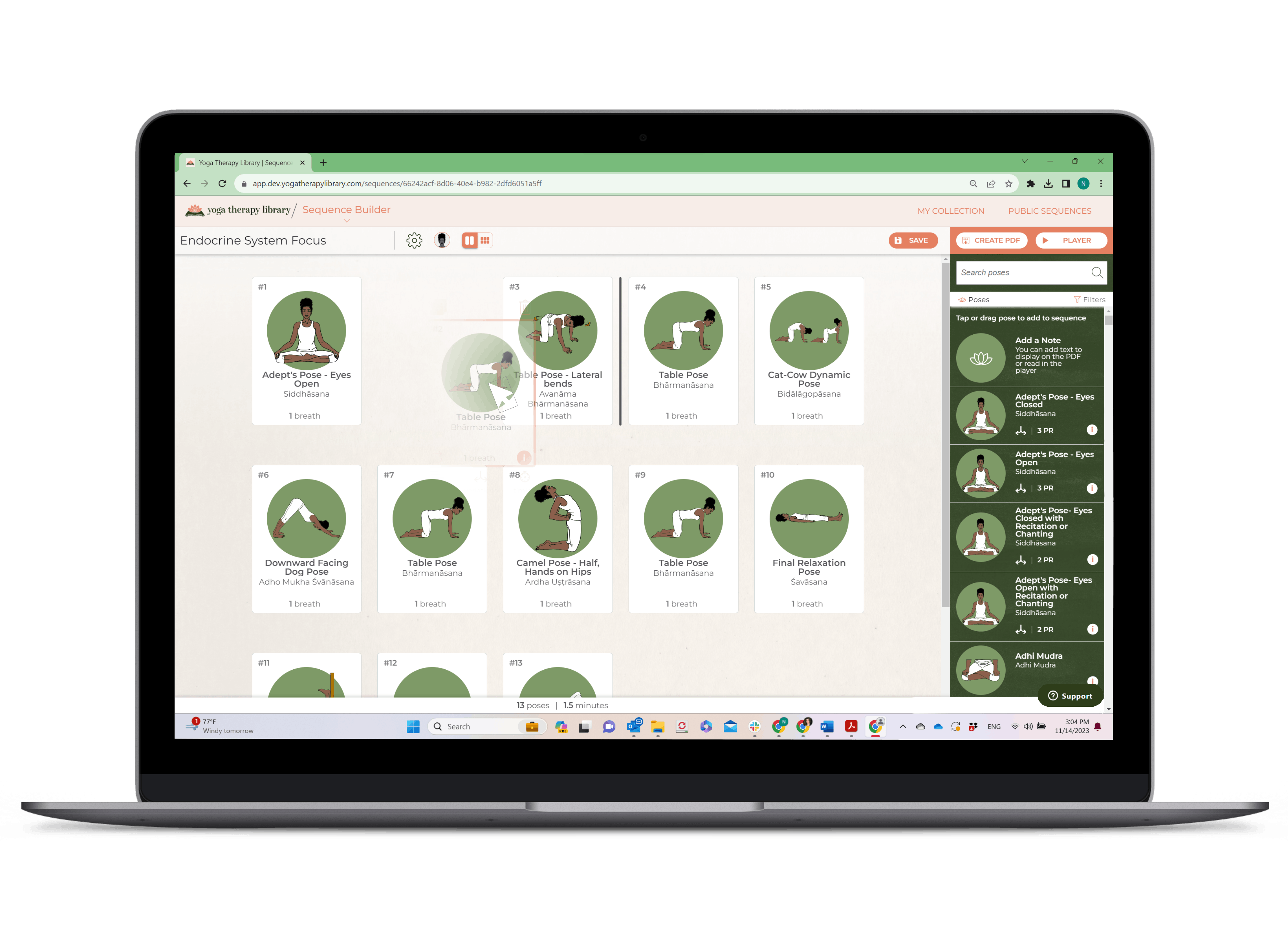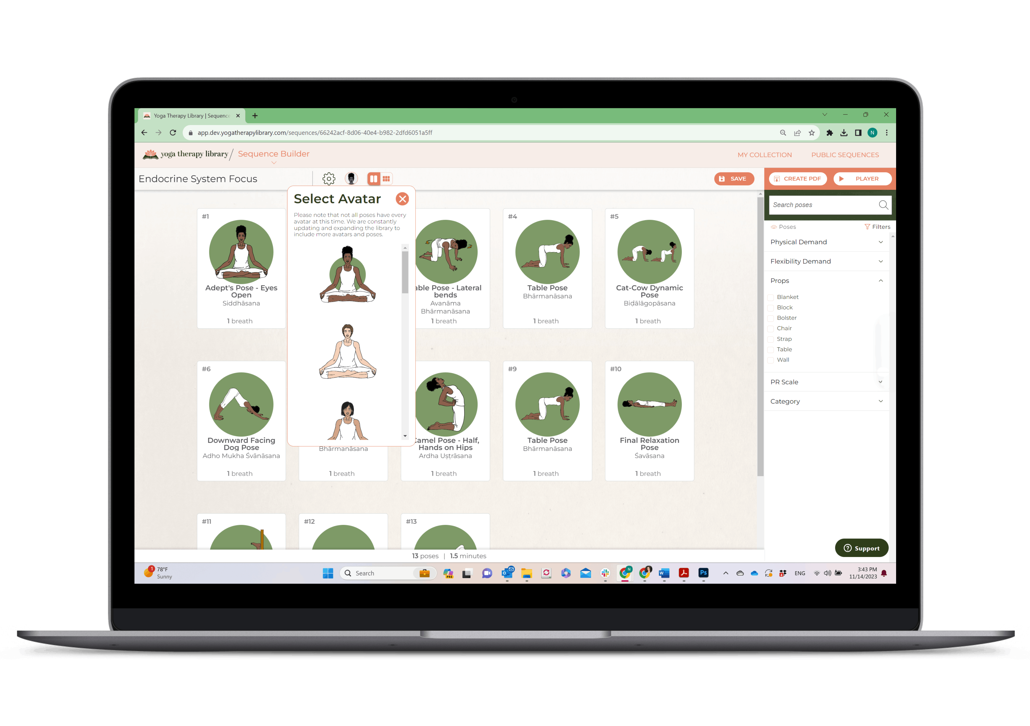 Create unique, customizable yoga sequences for every client. Our easy-to-use tool allows you to select an avatar, choose a series of yoga poses and pose variations, and customize cueing text and timing and then share the finished sequence via email or QR code. It’s professional, personal and easy-to-use.