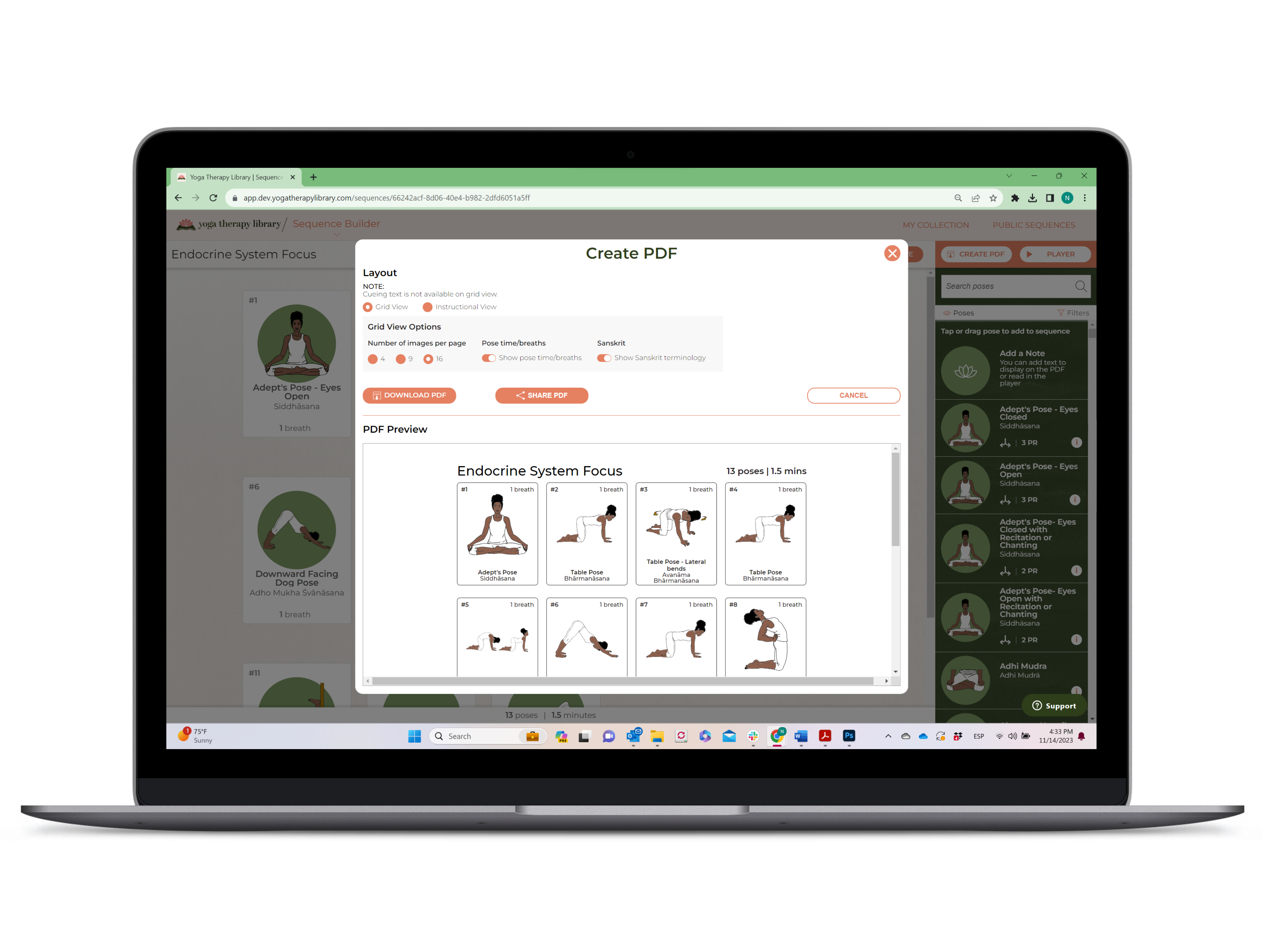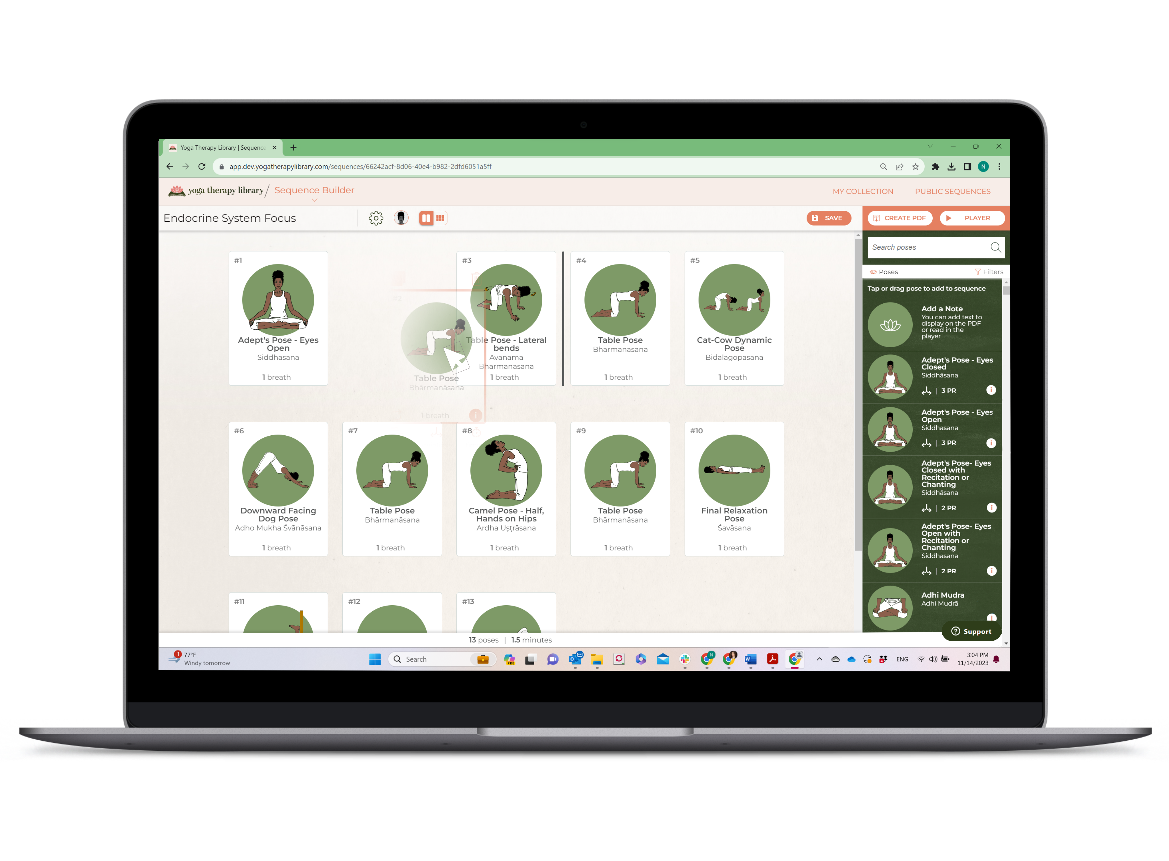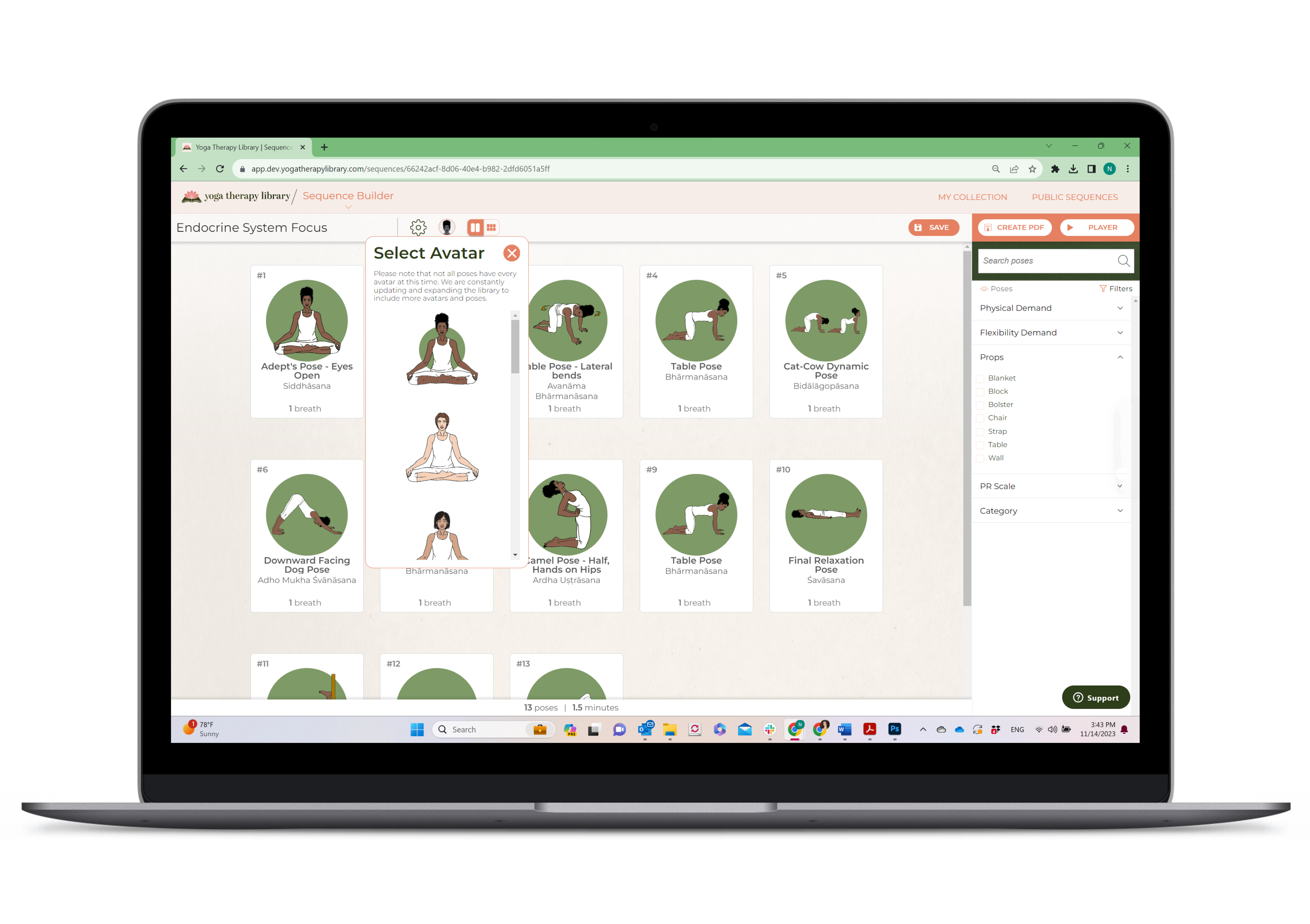 Create unique, customizable yoga sequences for every client. Our easy-to-use tool allows you to select an avatar, choose a series of yoga poses and pose variations, and customize cueing text and timing and then share the finished sequence via email or QR code. It’s professional, personal and easy-to-use.